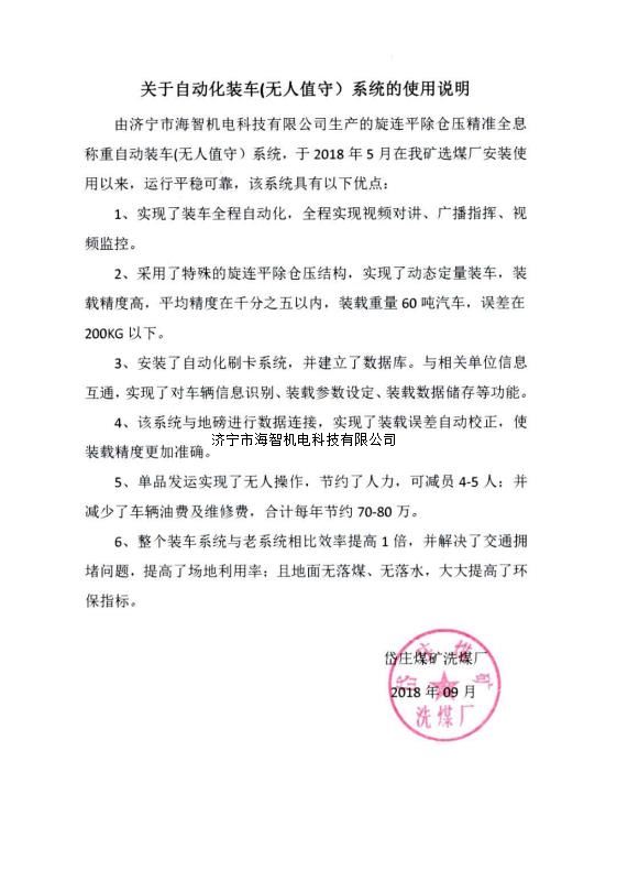 本產(chǎn)品一經(jīng)推出即獲得各大設(shè)計院及用戶的一致好評,率先在棗礦集團岱莊煤礦取得成功應(yīng)用,2018年9月受邀參加了《棗礦集團煤場封閉暨儲裝運系統(tǒng)智能化升級改造現(xiàn)場會》,智能裝車系統(tǒng)得到了充分肯定!我司憑借雄厚的加工制造實力及過硬的創(chuàng)新技術(shù)能力,勢必為運輸稱重系統(tǒng)、快速計量裝車系統(tǒng)帶來又一次的技術(shù)創(chuàng)新變革。